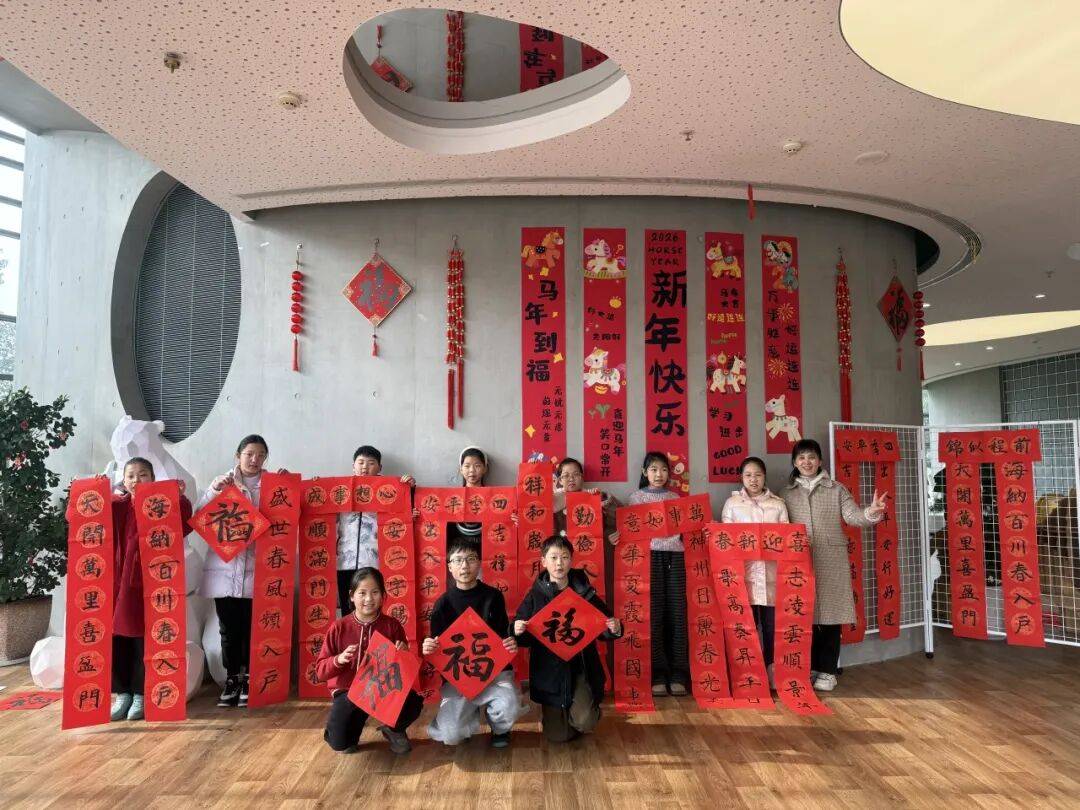 墨香袅袅,暖意融融。孩子们端坐案前,在老师的指导下凝神运笔、蘸墨书写,一撇一捺间尽显认真与专注。大家以春联为载体,将对新春的美好期盼、对家庭的温馨祝福融入笔墨之中,“家和万事兴”“平安喜乐”“阖家团圆”等饱含家文化的吉祥词句跃然纸上。一幅幅工整雅致、年味满满的春联作品,不仅展现了孩子们扎实的书法功底,更承载着对家庭幸福、阖家安康的美好祝愿。