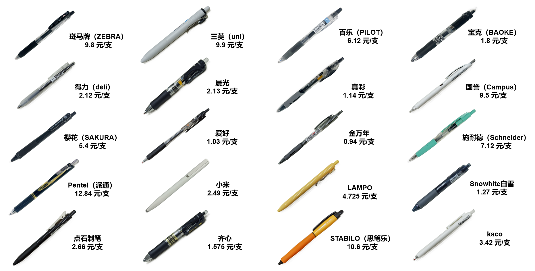 本次比较试验的20款中性笔样品,其中12款国内品牌样品的平均价格2.11元/支;8款国外品牌样品的平均价格8.91元/支。