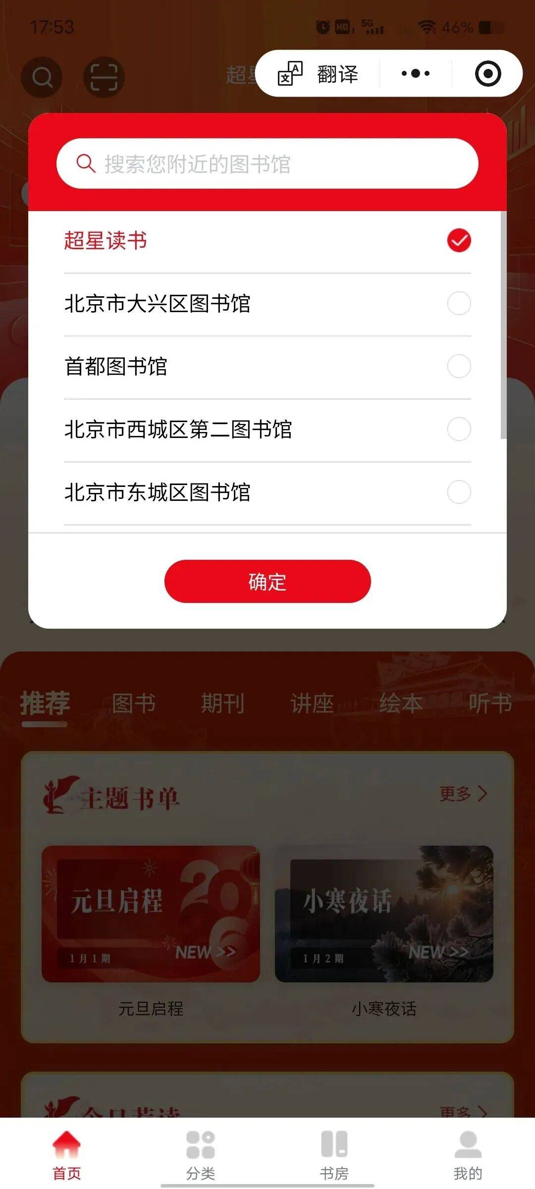2. 以超星读书为例,选择图书馆并授权登录→点击首页轮播图进入活动页面。